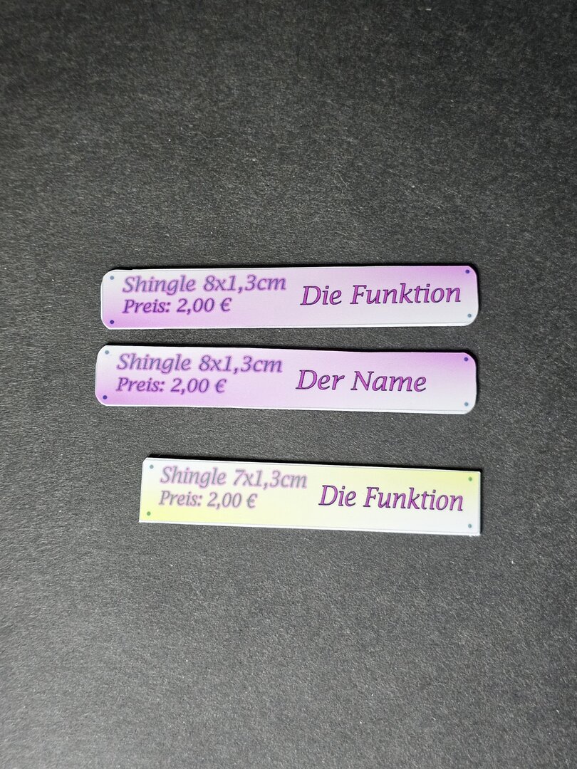 Ein Shingle ist ein Schild, welches gerne unter dem Badge angebracht ist. Eine Kombination, die meist verwendet wird. Das Shingle kann z. B. Den Namen des Mitarbeiters haben, aber auch deren Position wie Abteilungsleiter, Verkäufer, Berater usw.